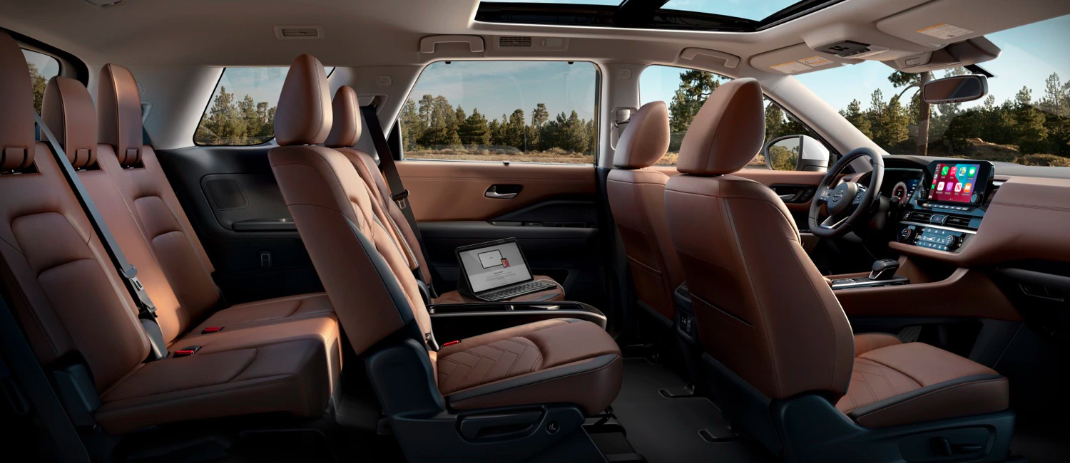 With three rows, the all-new Pathfinder offers vast space for seven or eight. When you have a crew of seven, the available second-row captain's chairs let you recline in style. If you're looking to seat up to eight, you can opt for standard bench seating. Either way, you'll have room for everyone's cargo thanks to under-floor storage. Plus, the Tri-Zone Automatic Temperature Control System keeps each row cozy or cool. And no matter where you sit, the available Dual Panel Panoramic Moonroof lets you take in the sky.